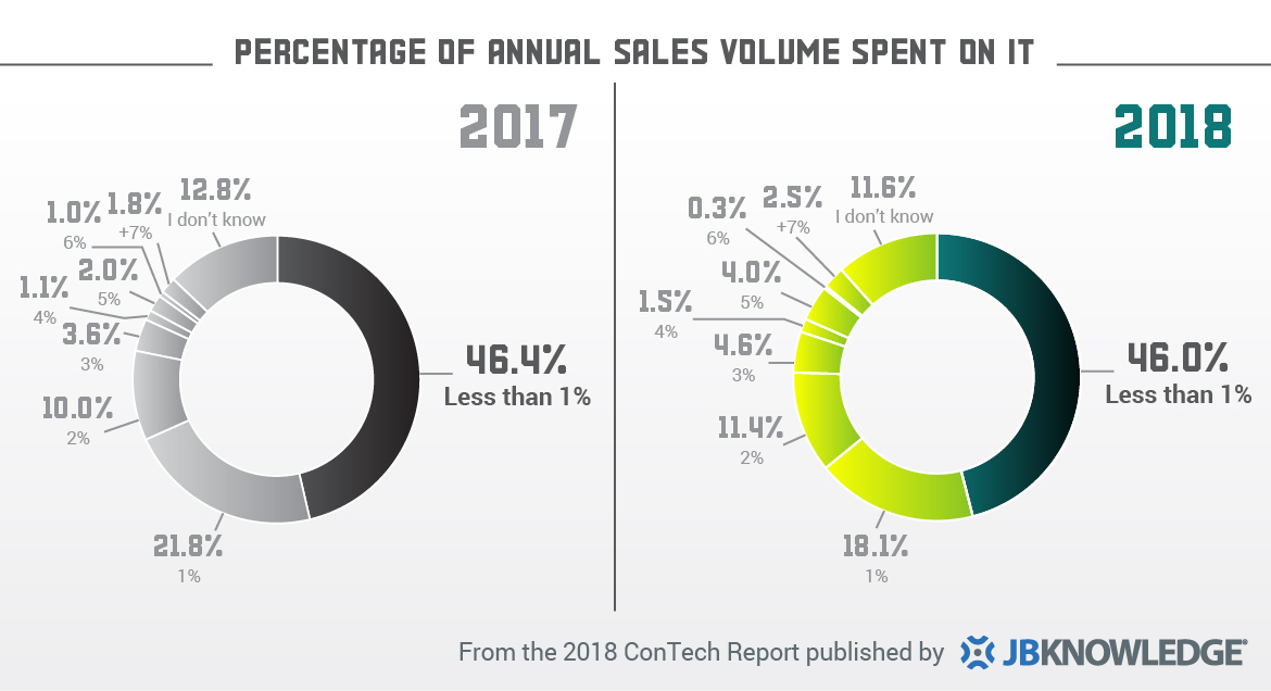 The report shows spending on IT was stagnant with 2017’s levels, with the majority of construction companies still investing less than a penny on IT for every dollar in annual sales.