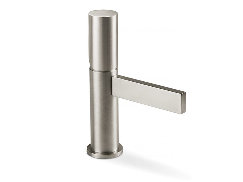 The Cylinder Handle is a small hub atop the faucet stem, identical and nearly seamless in shape. Users push the hub to operate the faucet and move it left or right to adjust the temperature. The single-hole faucet comes in two sizes: a tall 14 7/8-inch overall height or a more compact 8 1/2-inch overall height. Twenty-eight finishes are available, including satin nickel, burnished brass, carbon, french gold, matte black and white.