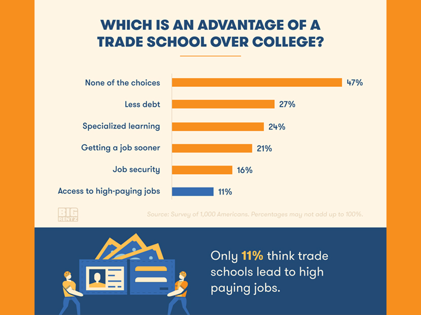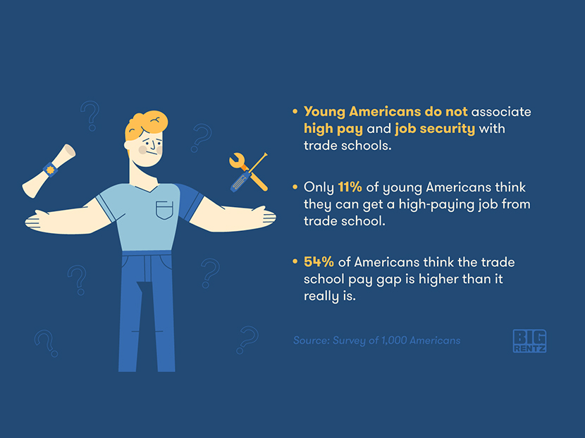 To find out how young Americans feel about trade schools, BigRentz surveyed 3,000 people on trade school advantages. Major takeaways include the following: