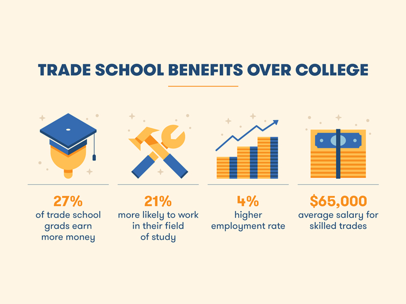 Trade schools offer a number of compelling advantages. Some programs take only six weeks to complete, while longer programs take up to two years. This is significantly shorter than a college program, which often requires four years. The average cost of a trade school education is $33,000 compared to a four-year college’s average $127,000 cost. On top of this, the debt accrued from a four-year college is on average three times the debt from a trade school.