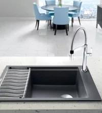 The PRECIS medium single sink with drainer features an integral drainboard. Has a crisp, angular design, durable SILGRANIT II surface and a unique wave-shaped integrated...
