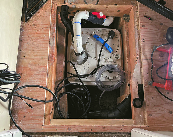 AR Plumbing avoids the costly job of busting through a concrete foundation to install plumbing for a full bathroom and washing machine by using the Saniflo Sanicubic 1.